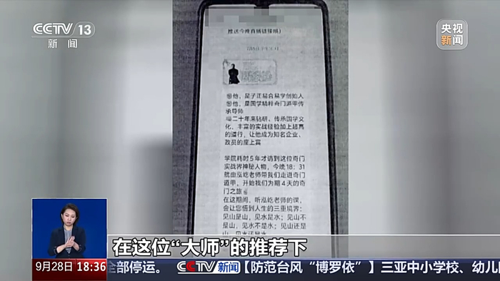 泰州市公安局姜堰分局天目山派出所副所长 储玥飞:在这位“大师”的推荐下,傅阿姨花3999元购买了风水课程,课程快要学完的时候,对方说傅阿姨很有潜质,但要“参透天机”还需深造,又推销起19800元的“高阶课程”。