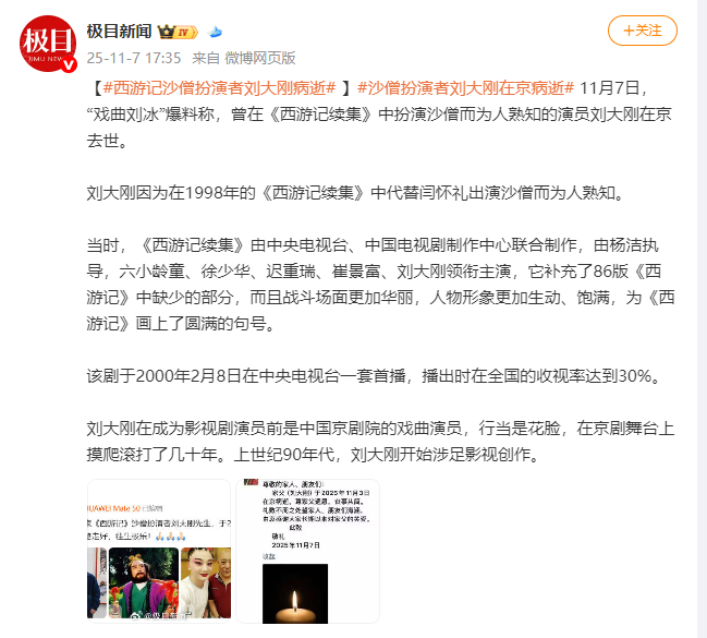 [西游记沙僧扮演者刘大刚病逝 ]11月7日,“戏曲刘冰”爆料称,曾在《西游记续集》中扮演沙僧而为人熟知的演员刘大刚在京去世。